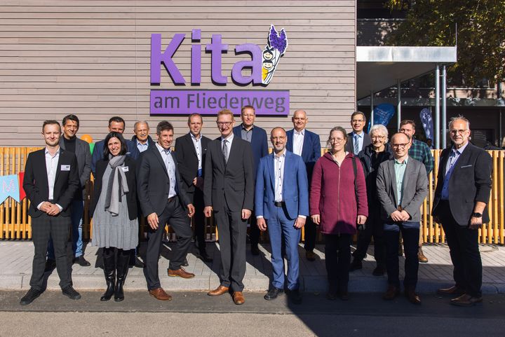 Insbesondere junge Familien profitieren von dem nachhaltigen Holzbauprojekt aus heimischen Hölzern. Sechs Millionen Euro investierte die Genossenschaft in den Bau einer Kindertagesstätte mit 90 Betreuungsplätzen für Kinder zwischen ein und sechs Jahren auf zwei Ebenen. Vier Millionen Euro stellt die Solidargemeinschaft aus der hauseigenen Mitglieder-Spareinrichtung zur Verfügung. Eine besondere Förderung erhielt das Projekt durch das Investitionsprogramm des Bundes zur Kinderbetreuungsfinanzierung, durch die Erzdiözese Freiburg zur Förderung bezahlbaren Wohnraums sowie durch die gemeinnützige Bauverein Breisgau Stiftung. Weiterhin sind im Obergeschoss kommunale Mehrzweckräume sowie sechs barrierefreie Genossenschaftswohnungen entstanden und komplettieren das kooperative Konzept. Die Errichtung erfolgte nach höchsten ökologischen Grundsätzen als KfW-Energieeffizienzhaus. Die ressourcenschonende Holzbauweise erzeugt ein besonderes Raumklima. Klimaschutz und CO2-Reduzierung sind hier nicht Positionspapiere, sondern geschaffene Realität.